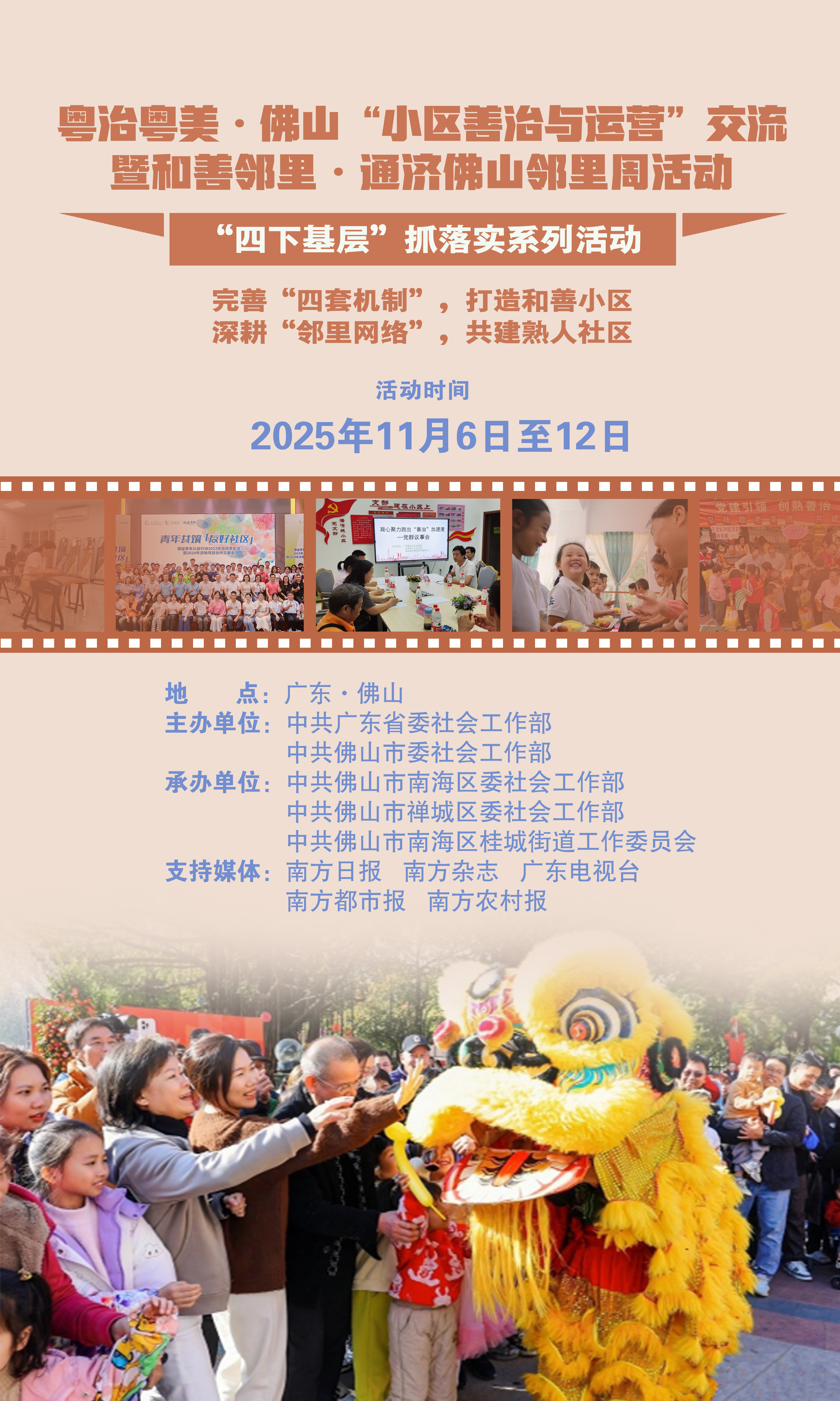 本次“和善邻里·通济佛山邻里周”活动,将于2025年11月6日至12日在佛山举行,届时将为广大市民呈现一场关于邻里和谐与社区善治的盛宴。